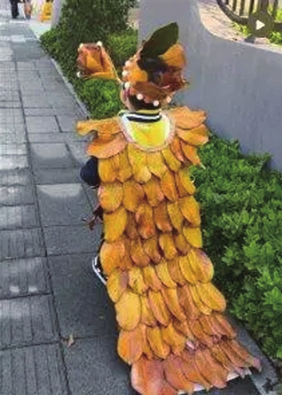 11月初,康康家附近的公园已是满地落叶,康康的妈妈王女士发现大片的金黄色广玉兰叶特别漂亮。“康康很喜欢动画片里的‘吉吉国王’,我觉得广玉兰叶和‘吉吉国王’的衣服材料有点类似,就想和儿子一起把它做成手工服饰。”