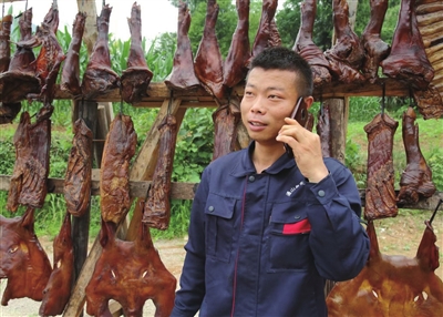 说干就干。阮长辉立即把村里的老屋改造成腊肉生产作坊,注册了腊肉生产个体户,并大量收购村里养猪农户的腊肉,请来村里老人作技术指导,风风火火开启了腊肉制作的序幕。由于生产作坊背靠隐水洞景区,第一批腊肉制成后,阮长辉逐个向景区各个农家乐进行推销,没想到收到了良好的反馈,前来观光旅游的外地食客,对这种“土色土香”的腊肉赞不绝口。这无疑给阮长辉打了一针“强心剂”,于是信心大增的他决定放手大干。为了使熏制腊肉的手艺更加精进,阮长辉专门跑到湖南湘西的腊肉加工厂学习取经,很快掌握了腊肉、五花肉、猪脚及腊肠的制作方法。回来后,阮长辉大展拳脚,一口气建了4间熏制房,从腌制到熏烤再到风干,阮长辉亲力亲为,将外面方法和本土方法相结合,终于生产出来的腊肉,达到了色泽金黄,香味浓厚、肥而不腻的效果。但由于他是小作坊生产,缺乏正规企业的资质认证,很多电商平台限制了他的销售渠道,这也制约了事业的发展。