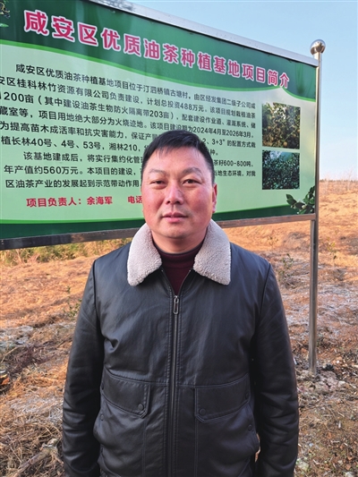 2023年,余海军积极按照公司安排,负责1200亩油茶基地建设项目,打造汀泗桥镇古塘村荒山绿色生态环境。在山上种植油茶,涉及6个村民小组130多户村民的协调工作。时间紧、任务重。为了尽快落实项目地块,余海军与时间赛跑,每天东奔西走、早出晚归,四处联系乡镇、村组、村民和相关设计部门,仅用了一个星期就确定了项目地块。随后,他又立即投入到租赁地块的测量复核工作中。当时,正值7月,天气酷热难忍,山上蚊叮虫咬,荆棘丛生。余海军每天背着一把大柴刀和一个水壶,带着测量人员在山上攀登跋涉,测量核实每户村民的荒山面积,反复测量存在异议的地块。二十多天下来,共测量面积近2000亩,落实了该项目的用地。“在那些日子,余海军的衣服挂破多次,手、脚也划得伤痕累累,整个人又黑又瘦……”忆起余海军在油茶基地建设中的情景时,该公司副总经理殷先波这样描述余海军乐于吃苦、无私奉献。