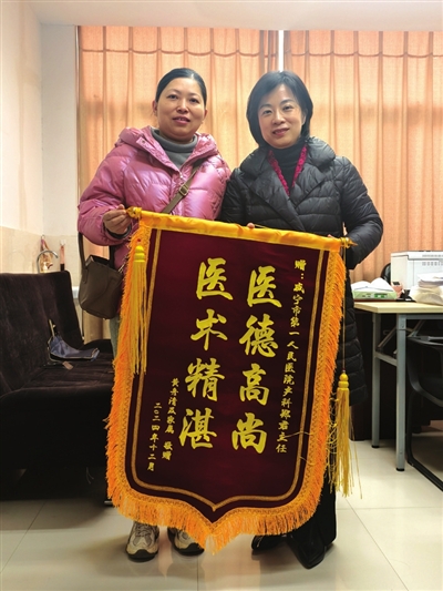 “先后两次怀孕,我的血压都高达180/109mmHg及以上,这让我非常害怕和焦虑,是您温暖的话语、细心的讲解以及鼓励给予了我力量,您和团队的高度的责任感和专业性给了我强大的保障,陪着我渡过了一次又一次的生产难关,为我们家庭带来了生机及希望,您就像一束光,是我们家的贵人,在我心里就像送子观音……”1月7日,家住咸安的黄女士专程来到武大中南医院咸宁医院产科,将一面绣有“医术精湛 医德高尚”字样的鲜红锦旗送到该院副院长郑君手上,向她表达感激之情。