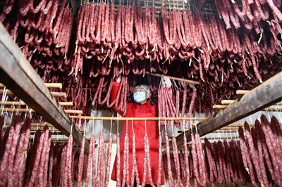 近日,在通城县食品公司烤房内,员工正下架刚熏烤好的香肠。春节临近,该公司员工加班加点制作火腿、腊肉、腊肠等食品,满足消费者需求。