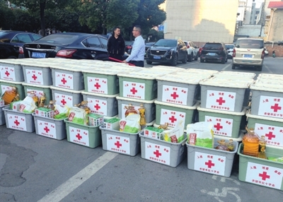 上午8时30分,赤壁市红十字会工作人员将一箱箱放有米、油、牛奶等生活物资的红十字家庭包搬出,仔细清点数量后有序装车,满载着230份爱心物资将陆续送到困难群众手中。