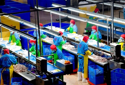 1月17日,嘉鱼县新街镇湖北浔味堂食品有限公司车间,工人们正在流水线上忙碌。该公司主要加工四大家鱼、牛蛙等食品,年产值1.8亿元,带动260余人就业。