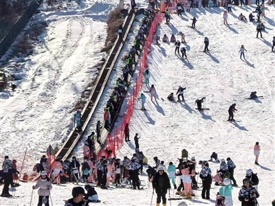 春节期间,通山县九宫山滑雪场迎来大量游客,大家自觉文明排队,秩序井然。