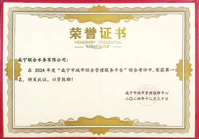 近日,在湖北省咸宁市城市管理指挥中心公布的2024年度“咸宁市城市综合管理服务平台”综合考评中,咸宁联合水务有限公司在供水设施及维护工作综合评分中荣获“第一名”,连续六年取得佳绩。此次荣誉的获得,是对我公司城市供水服务工作的巨大肯定。
