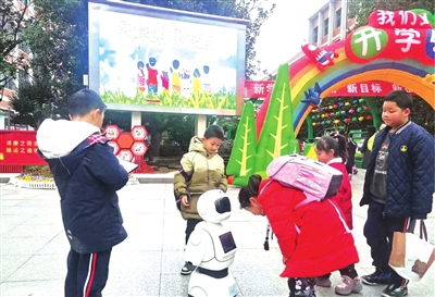 本报讯(通讯员王亚平 程志华)春风有信,花开有径。2月11日,咸宁市实验小学迎来新学期开学第一天。与往年不同的是,校门口迎接学生的不只有老师,还有智能机器人“宾果”。它们挥动机械臂与孩子们击掌互动,用童趣语音播报开学祝福,回答学生及家长提出的各种问题,引得家长和学生纷纷驻足围观拍照,校园内外洋溢着科技探索的热烈氛围。
