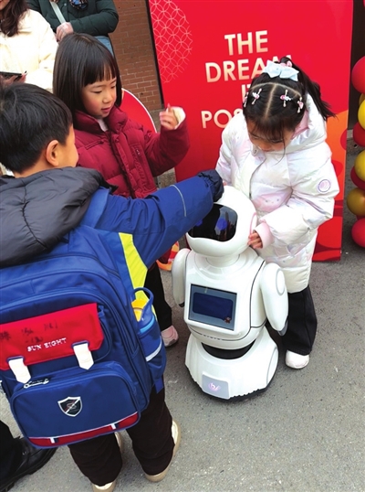 “宾果”在校门口热情的“欢迎同学们”,引导学生进校,给出新年寄语。机器人迎新,瞬间吸引众多学生家长上前围观互动。