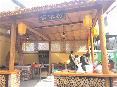 记者在现场看到,共享厨房是木质结构,约35平方米。厨房里的核心设施,当属用砖砌成的柴火灶,拢共两口大锅,配备一个穿越屋顶的烟囱。房檐上,挂着写有“邻味坊”牌匾,寓意睦邻友好,共享美味。