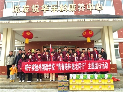 本报讯 (记者 熊大平 通讯员 阮智芝) 为深入学习雷锋精神,弘扬尊老敬老传统美德,3月8日,咸宁实验外国语学校团委联合第二党支部以“学雷锋志愿服务月”为契机,组织师生代表前往咸宁市福利院开展“青春陪伴 敬老同行”主题团日活动,以实际行动践行“奉献、友爱、互助、进步”的志愿精神,为老人们送去春日温情。