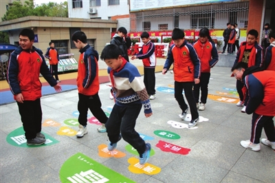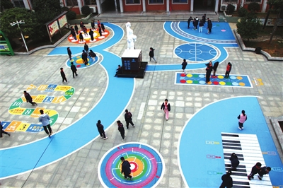 这是咸宁市实验小学在落实“课间延长5分钟”政策后,创新推出的一项举措。学校将传统文化、科普知识、安全教育、文明礼仪等内容与体育游戏相结合,把经典传统游戏“画”进校园地面,打造了一个集趣味性、教育性和运动性于一体的“地面游戏乐园”。