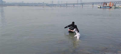 眼看男孩一步步走向江中,江水已经没过了他的腰,邓智慧脱掉外裤和羽绒服,下水朝着男孩走去。靠近男孩后,她一边伸出手紧握男孩的手不放,一边轻声安抚男孩的情绪。