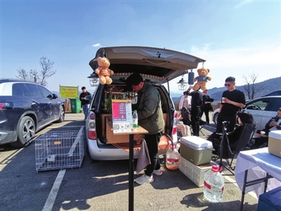 在山顶,来自省内各地的私家车停满了山上的停车场,销售美食、儿童玩具、手工等产品的摊位吸引了众多市民游客购买,扫码支付声不断,摊主制作美食忙个不停。