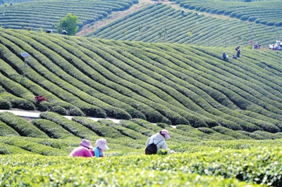 3月20日,春风和煦,暖阳普照,位于中伙铺镇董家岭村娘娘山的茶叶基地上,鲜嫩的茶芽冒出枝头,采茶工们头戴斗笠、腰挎竹篓,指尖轻捻,将鲜嫩的一芽一叶收入茶篓。