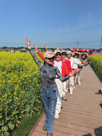 步入花海,千亩鎏金的油菜花中“点缀”着花园巴士、艺术雕塑等42处网红打卡点,搭配蜿蜒的木质栈道与观景平台,游客沉浸其中打卡拍照不亦乐乎。除了亲子家庭游、姐妹游、团建游,还汇集了非洲鼓、旗袍秀、广场舞、素描写生等团队,共同赶赴这场春之盛宴。