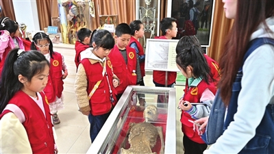 讲座结束,来到标本陈列展厅,小记者们瞬间被琳琅满目的人体标本所吸引。志愿者首先进行了参观提示,“这里的标本都是大体老师的遗体,他们献身医学,是很值得我们尊重的,希望大家文明参观。”虽然小记者们对“大体”这个词语有点陌生,但是志愿者严肃的语气,让刚刚还谈笑风生的小记者们肃然起敬。他们依次参观了人体各大系统标本,从骨骼肌肉到内脏器官,从神经系统到循环系统,近距离观察人体构造,学习人体各器官的功能和运作机制。