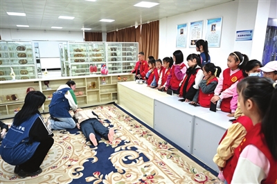 除了参观标本,小记者们还参与了丰富多彩的互动体验活动。在“心肺复苏”展区,志愿者讲解心肺复苏要领,分解动作示范。在实操环节,小记者们在专业人员的指导下,学习心肺复苏的操作步骤和注意事项,掌握了这项重要的急救技能。互动之中,还吸引了同行家长的参与。