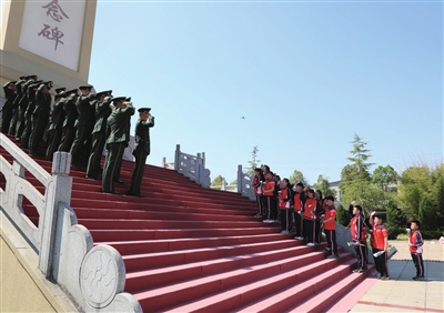 3月26日,鄂南革命烈士陵园,武警湖北总队咸宁支队官兵清明祭奠结束返程时,与前来开展清明祭英烈活动的咸宁市实验小学的一群小学生在烈士纪念碑前相遇,见到武警官兵,同学们自发行起了少先队礼,官兵们驻足,立即向小学生回敬军礼。 (记者 陈婧 通讯员 刘昊松 司马豪诚 董浩朋)