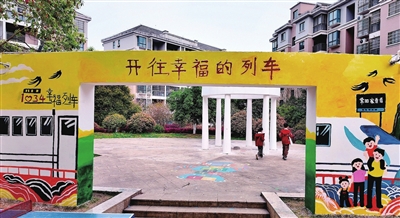 这堵墙上,前后两面用丙烯颜料画上了蓝天、白云、绿树等自然元素,与“幸福列车”的主题交相辉映,周边的地面和垃圾桶也进行了彩绘,吸引着往来居民驻足观赏、拍照。