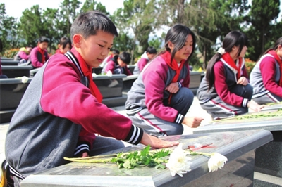 仪式结束后,师生们走进陵园深处。在烈士墓区,孩子们轻拭墓碑,献上白菊。指尖触及冰凉的碑石,仿佛触碰到了历史的温度。有学生驻足于11岁黄墩兴烈士墓前久久不语。六(三)班学生李灵君蹲下身,轻轻抚过墓碑上的名字,难过地说:“黄墩兴烈士牺牲时只有11岁,和我们五年级学生一般大。作为新时代的少年,我们不仅要珍惜烈士们拼死换来的和平,更要以他们为榜样——用知识武装头脑,用行动诠释担当。终有一天,我们也要让祖国因我们的奋斗而骄傲!”