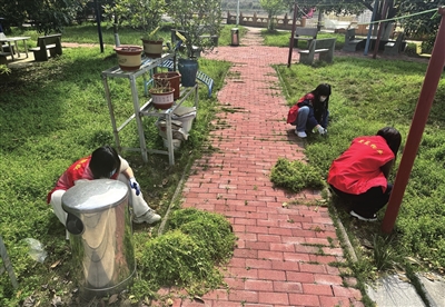 供电小区草坪上,包保单位志愿者和“桂乡管家”戴着手套埋头清理杂草和垃圾。随着杂草被相继清除,原本杂乱的草坪逐渐恢复生机。