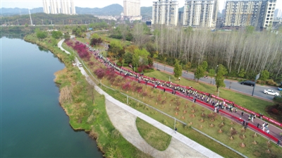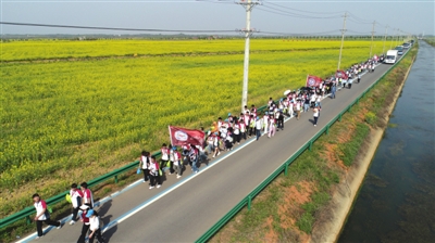 全体师生途经咸宁大道、嫦娥大道,沿淦河、咸安大道、107国道到达向阳湖湿地公园。各班秩序井然、红旗招展,嘹亮的口号此起彼伏,队伍蜿蜒行进。