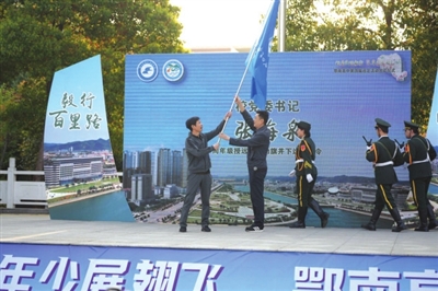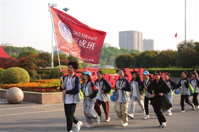 随后,校党委书记张海泉向年级授予远足活动旗帜,并下达出征令。伴随着战鼓声,学生们高举班旗,迈过出征门,精神抖擞地踏上征程。