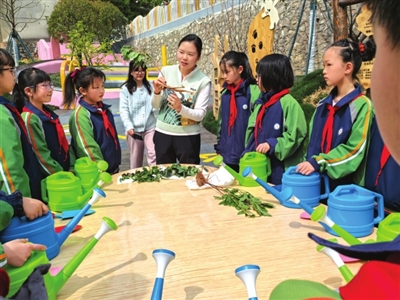 本报讯(记者黄兰芬) 4月3日上午,在咸宁市南门小学(咸宁市第四小学)儿童友好示范项目彩虹公园内,15名学生手握小铲子和洒水壶,在彩虹楼梯旁的植物园里栽下青椒、番茄、白芍等幼苗。