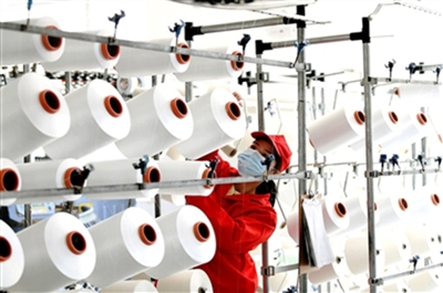 近日,通城县关刀镇工业园盛诚纺织车间,员工正在纺布。
