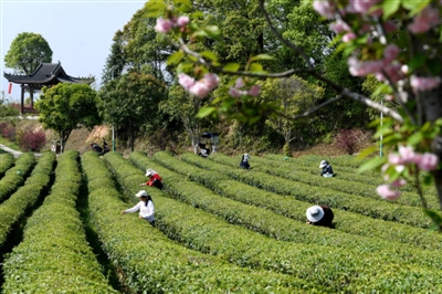 4月10日,通城县沙堆镇九井峰茶文化生态园,员工在采摘春茶。