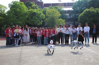 当日上午9时许,崇阳县第二实验小学操场上,4架银色“冲天火箭”巍然矗立。随着主持人的一声令下,20台跳舞机器人列阵齐舞,灵活的身姿与电子乐交织成未来序曲;两只灵动的机器狗穿梭其间,时而作揖迎宾,时而翻腾跃起,时而与嘉宾互动,引得现场领导与观摩人员连连惊叹。