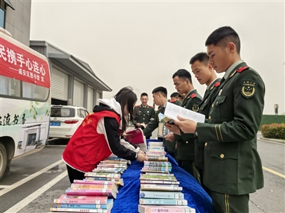 看擒拿表演、观军营文化、赠特色书籍、搞读书分享、享沉浸式阅读、赏文艺节目……4月12日,咸安文联、区文旅局与向阳湖镇政府联合主办的“书香盈怀传深情,军民携手心连心”联欢读书活动在武警湖北总队咸宁支队某部举行。区朗协、区作协、区诗词楹联协会、向阳湖镇新时代文明实践所与百余官兵一起联欢,学习互动中增进了军民鱼水情。(特约记者胡剑芳 通讯员张冲)