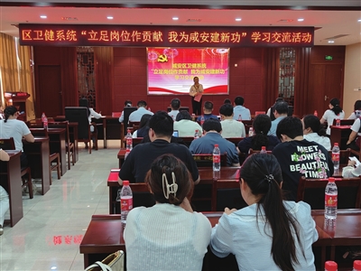 本报讯(记者 葛建伟 通讯员 朱钢铁 方昭华 丁山一洋)4月18日下午,咸安区卫健局以桂乡讲堂形式,在区中医院门诊大楼六楼会议大厅举办“立足岗位作贡献,我为咸安建新功”为主题的交流分享活动。
