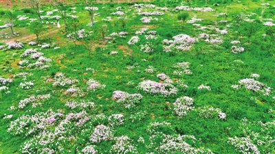 4月20日,城区银桂路一侧、咸安区档案馆对面,可见一大片美丽的月见草。朵朵淡粉色花儿,一簇一簇的,东一大片,西一小片,分布在绿色草地上。