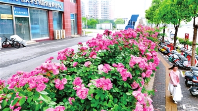 粉色蔷薇花长廊与横跨道路的蓝白知行桥,扮靓了职院路,组成一幅现代建筑与自然共生的美丽画卷。