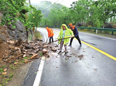 近日,一场暴雨过后,崇阳瑞阳交投集团通衢公路养护有限公司组织养护人员疏通积水路段、桥梁泄水孔,清除倒伏树木,清理路面淤泥、山体落石,确保国省干线公路安全畅通。