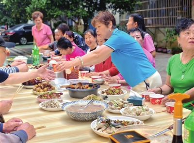 活动现场,摆满佳肴的长桌延展如画卷,北方手工莜面、酱香肘子、肚包肉、咖喱虾仁等居民自制菜品琳琅满目,色香味俱全。居民围坐品鉴佳肴,分享生活趣事,欢声笑语此起彼伏。