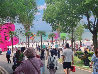 当日记者在该景区看到,银沙滩处,摇曳的棕榈树、白色的细沙、飞溅的浪花与彩色的热气球构成了一幅绝美的图景。游客们或是赤足漫步在沙滩上,或是乘坐摩托艇于湖面上激情冲浪,或是登上热气球从高空俯瞰蜜泉湖旅游度假区全景……多样的游玩方式和游玩项目将游客体验感直接拉满。