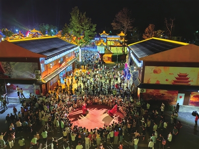 当晚,灯火璀璨,街市如昼,恋江湖船歌岛景区(嘉鱼不夜城)在夜色下熠熠生辉,景区内游客摩肩接踵,好不热闹。走在该景区颇具古风韵味的街道上,可以看到孙悟空、猪八戒等耳熟能详的神话人物,孙悟空龙宫借宝、猪八戒撞天婚、女儿国招亲等经典故事经真人演绎展现在眼前,沉浸式的西游文化体验令人乐而忘返。