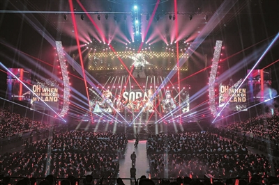“国风才是最酷的。”柳闵淳告诉记者,“星铁LIVE”的“仙舟罗浮”篇章是大家公推的“第一”。《君莫笑》以极具张力的东方美学惊艳亮相,舞者持酒坛登场,展现出“酒入豪肠”的侠义风骨。《燎沉香》中,舞者借助高空威亚装置踏风而行,红色长袖划出优雅曲线,勾勒出敦煌壁画的流动神韵。《水龙吟》压轴登场,环形激光矩阵模拟出波涛汹涌的海洋,全场观众的大合唱尽显“苍龙破海”的气势。