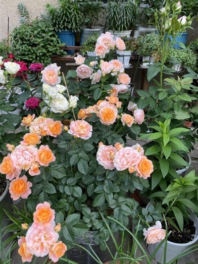 花主是50岁的居民孙霞。孙霞介绍说,她家在老招待所小区的入口处,多年前就对养花种草产生浓厚兴趣。但是以前没有了解花草的习性,种植的花草不成规模,也不好看。直到几年前,孙霞在自己的瑜伽工作室里,结识了一群爱种花草的姐妹。通过姐妹们的教授,她逐渐了解常见花草的习性,养花技术越来越娴熟,家里的花儿也越来越多。她便将这些花放置于家门口,打造了一个微型月季园。