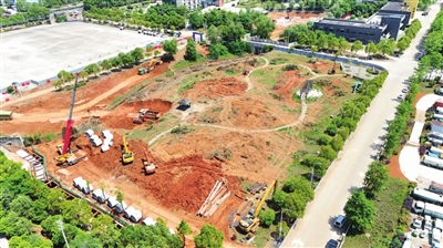 4月29日,咸宁高新区合加厂区内,浮山片区排水防涝治理工程子项生态调蓄池建设工程施工现场,多名施工员来回穿梭,车辆装载渣土进进出出,一片繁忙景象。