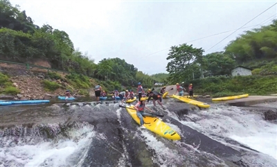 崇阳港湍急段与平缓段交错分布,水质清澈,为桨板运动提供了绝佳条件。当天,游客们从崇阳港上游出发,他们双手持桨,脚踏各色桨板,驰骋在水面。在约两个小时的漂流时间里,游客们一边饱览两岸秀美风光,一边体验桨板运动带来的快乐。