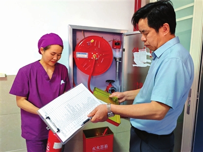 检查组一行先后对消防控制室、氧气房、产房、手术室、新生儿科、检验科、药房、药库及食堂等重点部位进行“地毯式”排查,重点检查了院内消防控制系统运行状态、消防器材配备时效及职工操作熟练度、氧气房设备安全警示标识、管道阀门维护记录以及各科室区域用电线路隐患,严格核验检验科试剂储存条件、药库易燃易爆品存放规范,强调“双人双锁”制度落实。