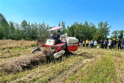 理论学习后,与会人员移步至赤岗村油菜种植示范田。烈日下,两台收割机在金黄的油菜田中轰鸣作业:一台联合收割机“一气呵成”完成收割、脱粒、清选;而另一台分段收割机则在前期完成机械割倒后,现场进行捡拾、脱粒。专家现场对比两种方式的数据:“分段收割损失率可控制在10%以内,较传统联合收割降低10-15个百分点。”