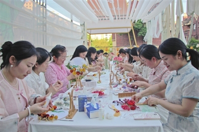 在创意手工 DIY 环节,护士们充分发挥创意,将花卉元素与美好愿景融入团扇、手链制作中,享受指尖创作带来的疗愈乐趣。