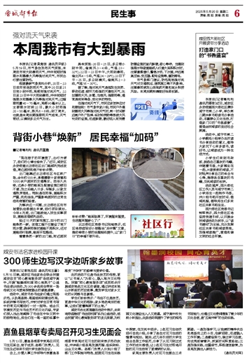 本报讯(记者吴青朋 通讯员尹航)5月19日,市气象台发布天气预报,本周我市有大到暴雨天气,并伴有短时强降水和雷暴大风等强对流天气,市民出行要注意防范。