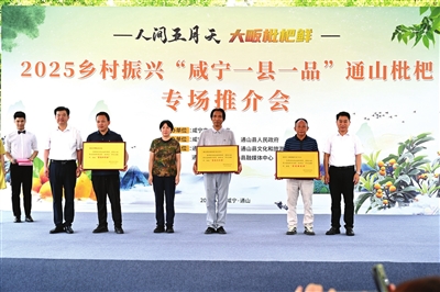 五月的通山县大畈镇,富水湖波光潋滟,漫山枇杷缀满枝头,金黄果实在阳光下泛着诱人的光泽。5月20日,2025乡村振兴“咸宁一县一品”通山枇杷专场推介活动在大畈镇枇杷科普馆拉开帷幕,来自省市县各级领导、农业专家、企业代表及果农齐聚一堂,共品枇杷甘甜,共谋产业未来。