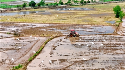 5月19日,嘉鱼县新街镇三畈村的水稻田间,一位农机手正驾驶农机翻耕土地。成群白鹭紧随农机翩跹起舞,时而俯身啄食翻出的泥鳅、田螺,时而驻足新翻的泥土间寻觅昆虫,勾勒出人与自然和谐共生的生态图景。