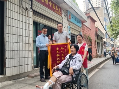 本报讯 (记者陈志茹 通讯员樊敏 张茹钰 徐丹霞)5月11日,咸安区温泉街道希望桥社区居民毛元英一家将一面印有“素不相识伸援手 助人为乐显真情”的锦旗送到热心居民孙世平手中,感谢他的暖心相助。