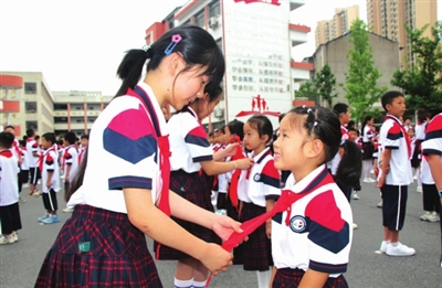 “红领巾是革命先烈用鲜血染红的旗帜,希望新队员像爱护眼睛一样爱护它!”咸安区实验学校教育集团党支部委员舒文华在致辞中,勉励全体少先队员勤学笃行、立志报国,同时要求辅导员们以爱心和智慧引领少年成长。最后,全体队员在大队辅导员的带领下呼号:“准备着,为共产主义事业而奋斗!”——“时刻准备着!”铿锵的回应声,凝聚着新一代接班人的信念与担当。
